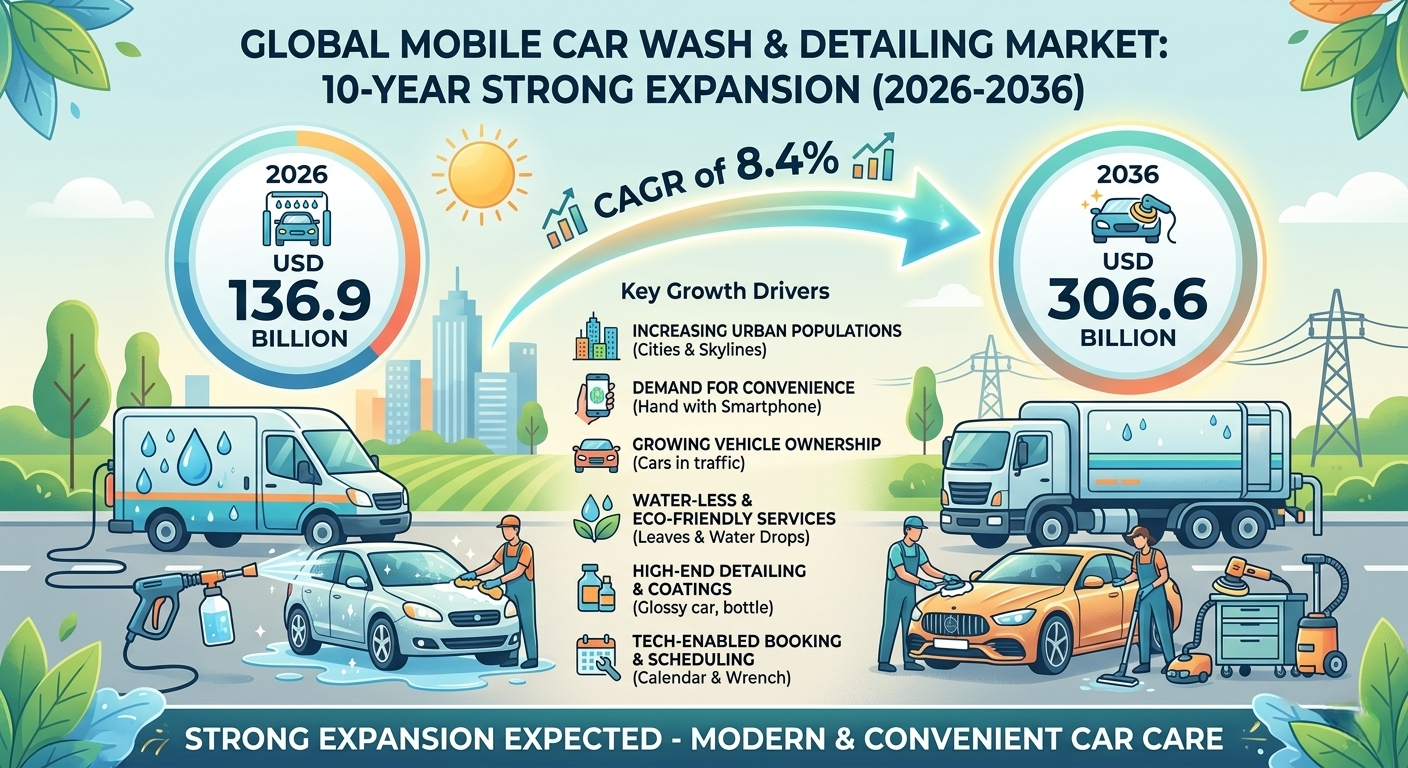 The global mobile car wash and detailing market is expected to experience strong expansion over the next decade, rising from approximately USD 136.9 billion in 2026 to USD 306.6 billion by 2036, registering a CAGR of 8.4%, according to the latest analysis by Future Market Insights (FMI).